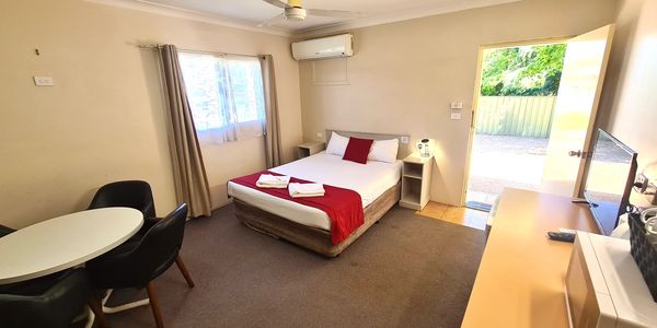Our riverside queen rooms are small and are the perfect option for a guest looking for an affordable room. Located on the river side of our complex, closer to our BBQ area. These rooms are pet-friendly on request.
